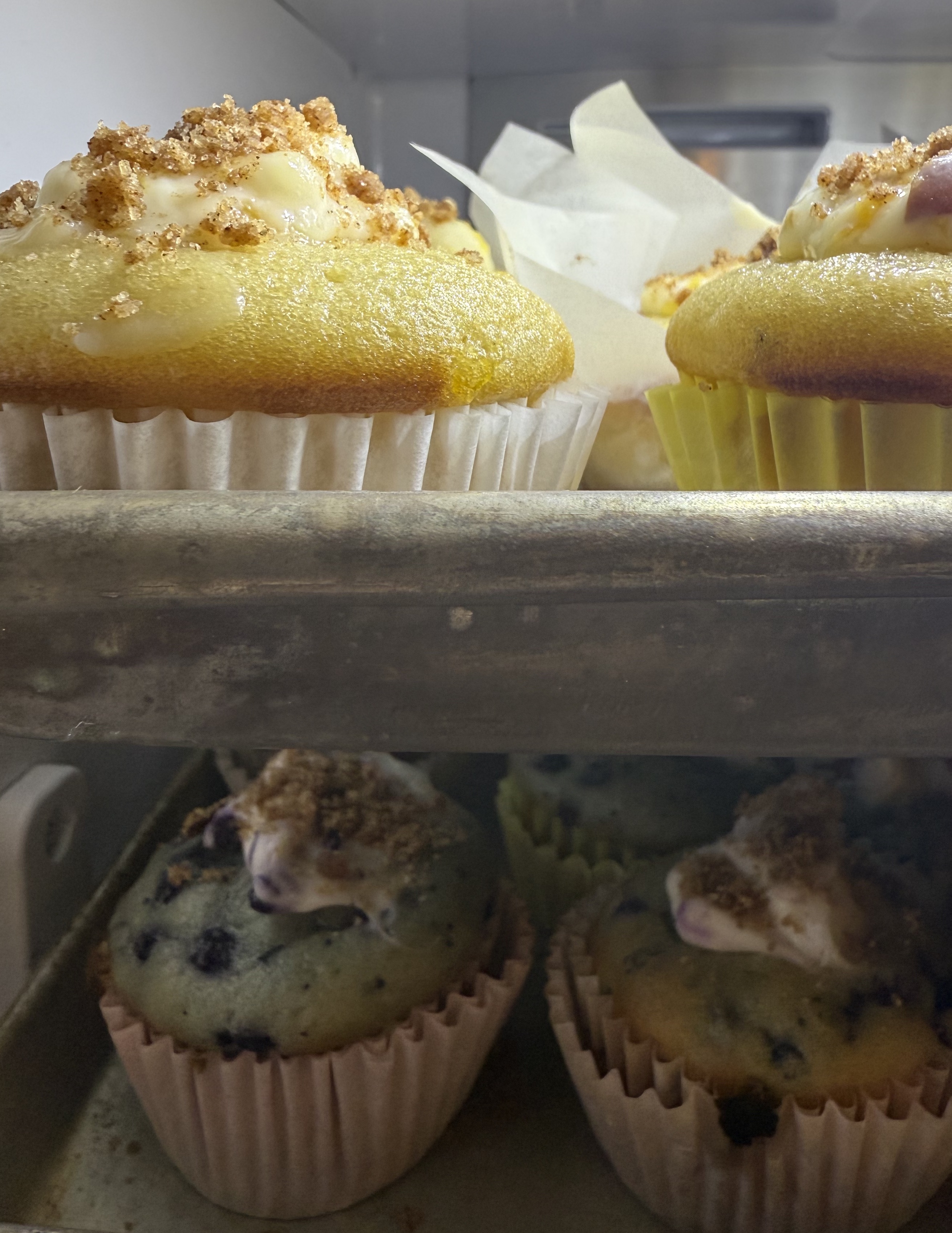 Our most recent delivery included a blueberry muffin and a peach muffin, both topped with a sweet cream-cheese and crumble topping. Past orders included banana bread, cream-cheese-frosted pumpkin bread, peanut butter cookies, and chocolate chip cookies. Upcoming orders will include Staci's famous carrot cake slices, tempting butter cookies, and more muffins. |